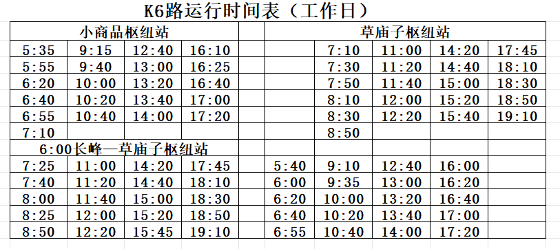 運行時間:長峰(中諾口腔)6:40、17:08;草廟子樞紐站6:52、7:27、18:00;K6路工作日運行計劃同時優(yōu)化調(diào)整(詳見附件)。